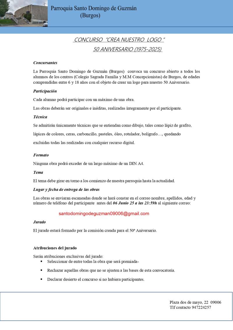 Estimadas familias, la Parroquia Santo Domingo de Guzmán (Burgos) os invita a participar "Crea nuestro un logo" por nuestro 50 Aniversario, a todos los alumnos de los centros (Colegio Sagrada Familia y Madres M. Concepcionistas de Burgos), en edades comprendidas entre 6 y 18 años.